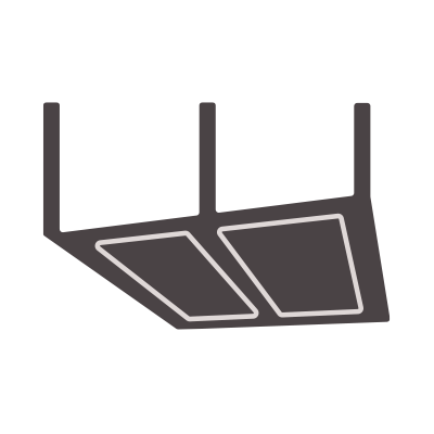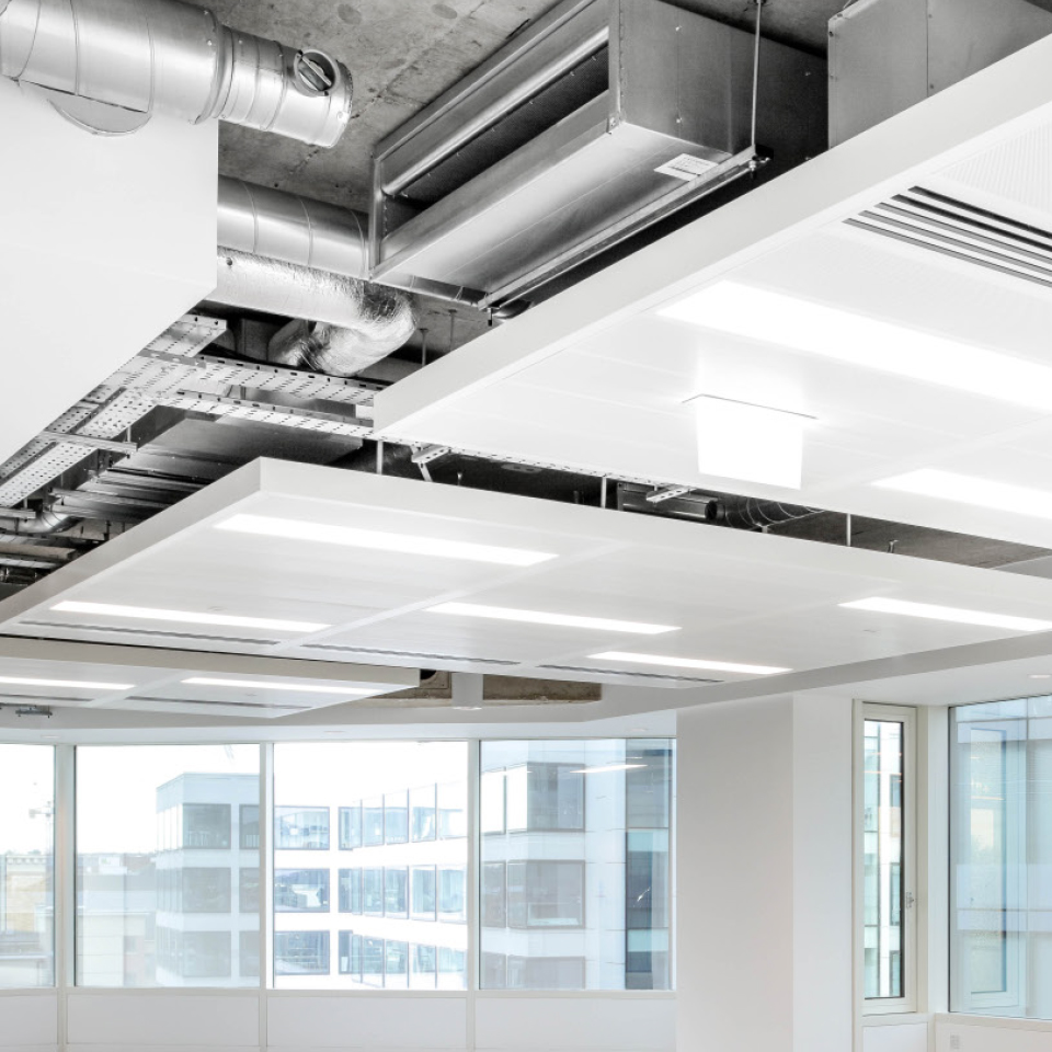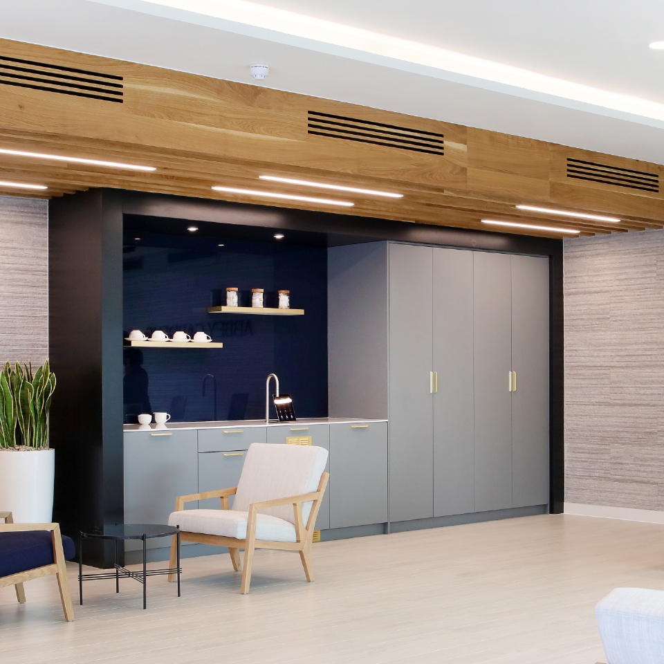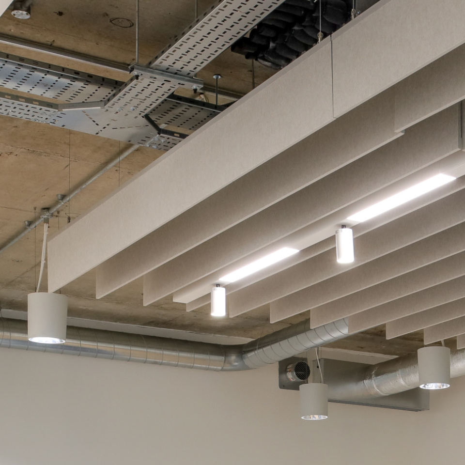 Modern mix of raft, exposed, and suspended ceiling finishes
