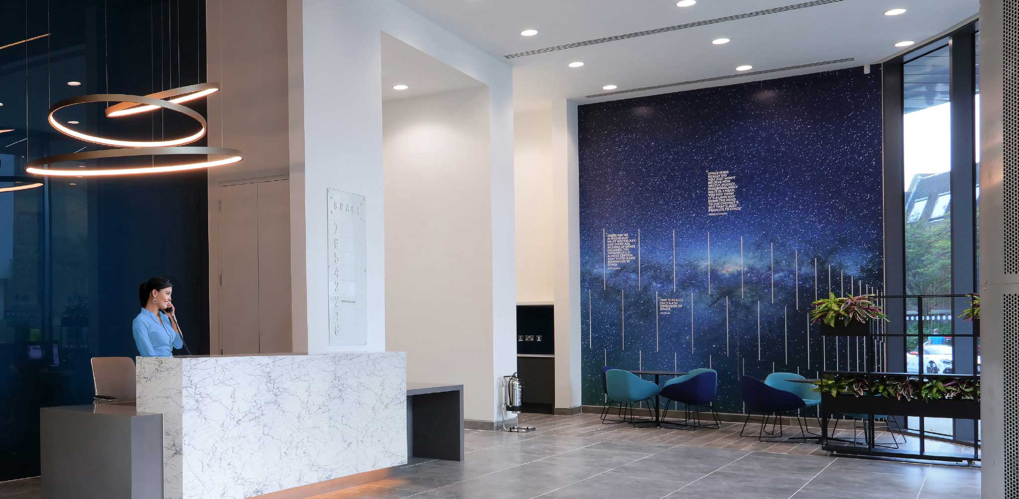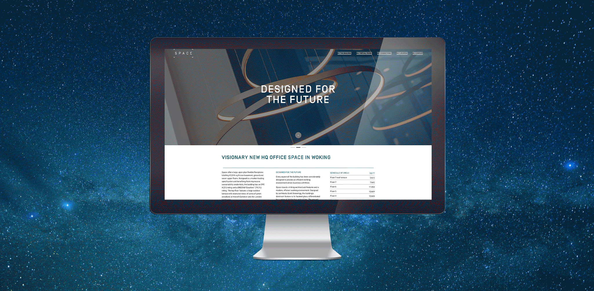 Space is an 87,010 visionary HQ office in Woking. Indent developed the inherited branding and created a theme that would inspire prospective and existing tenants as they made their way through the building.